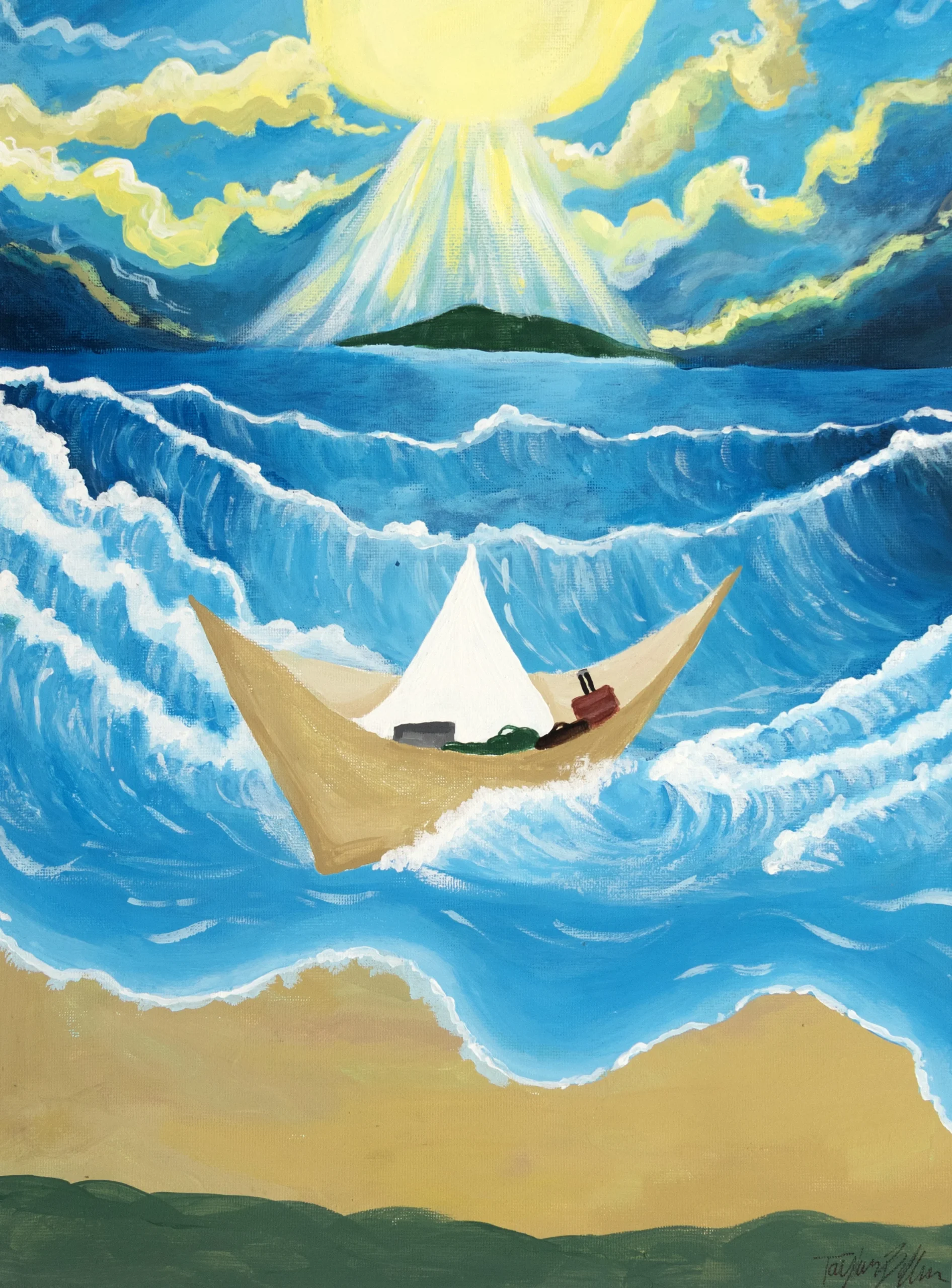As you see on this canvas, there is a paper boat trying to sail. There are huge waves crashing down on it, but it doesn’t give us. The waves represent challenges ahead for the called; obstacles toward where God called us to be. Each wave grows smaller the closer you get, but they can still sink the paper boat. The light shines on the land ahead because this is where the Lord is summoning his evangelists. Even if the boat sinks, his plan will still shine bright!