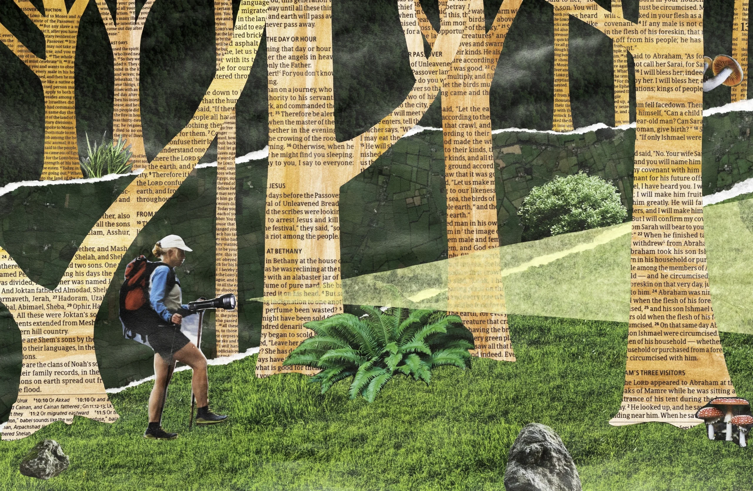 This piece was created to represent the beginning phase of curiosity and exploring God’s word and His will for us. The Bible isn’t a small book, and as we study it, we gain a greater understanding by piecing together the stories and lessons as I have literally pieced together this paper collage. Each book, chapter, and verse holds a wealth of spiritual knowledge and guidance on its own, but together they reveal even more, and by studying them in context individually and as a whole, we begin to see the bigger picture- seeing the forest through the trees. I think the “bigger picture” is ultimately God’s love and plan for the world.