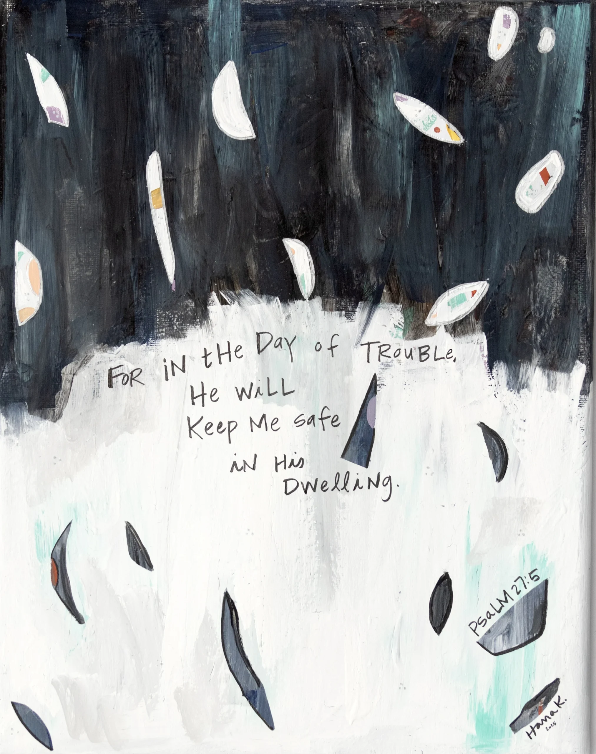 Throughout our lives, we will face hardships and trials that can feel insurmountable in the moment. Sometimes we feel so consumed by the darkness that we can no longer see the light, but we still are called to trust in Jesus and lean on Him for the strength to keep enduring the storm. When creating this painting I reflected on my own journey with mental health. There were many times when I was so consumed with depression that doubted it would ever get better, but I kept going anyways, and God carried me through and out of that season of life. Everyone will face times of uncertainty and unexpected trouble, but we still trust that God will take us where we need to be, and all we have to do is keep moving forward.