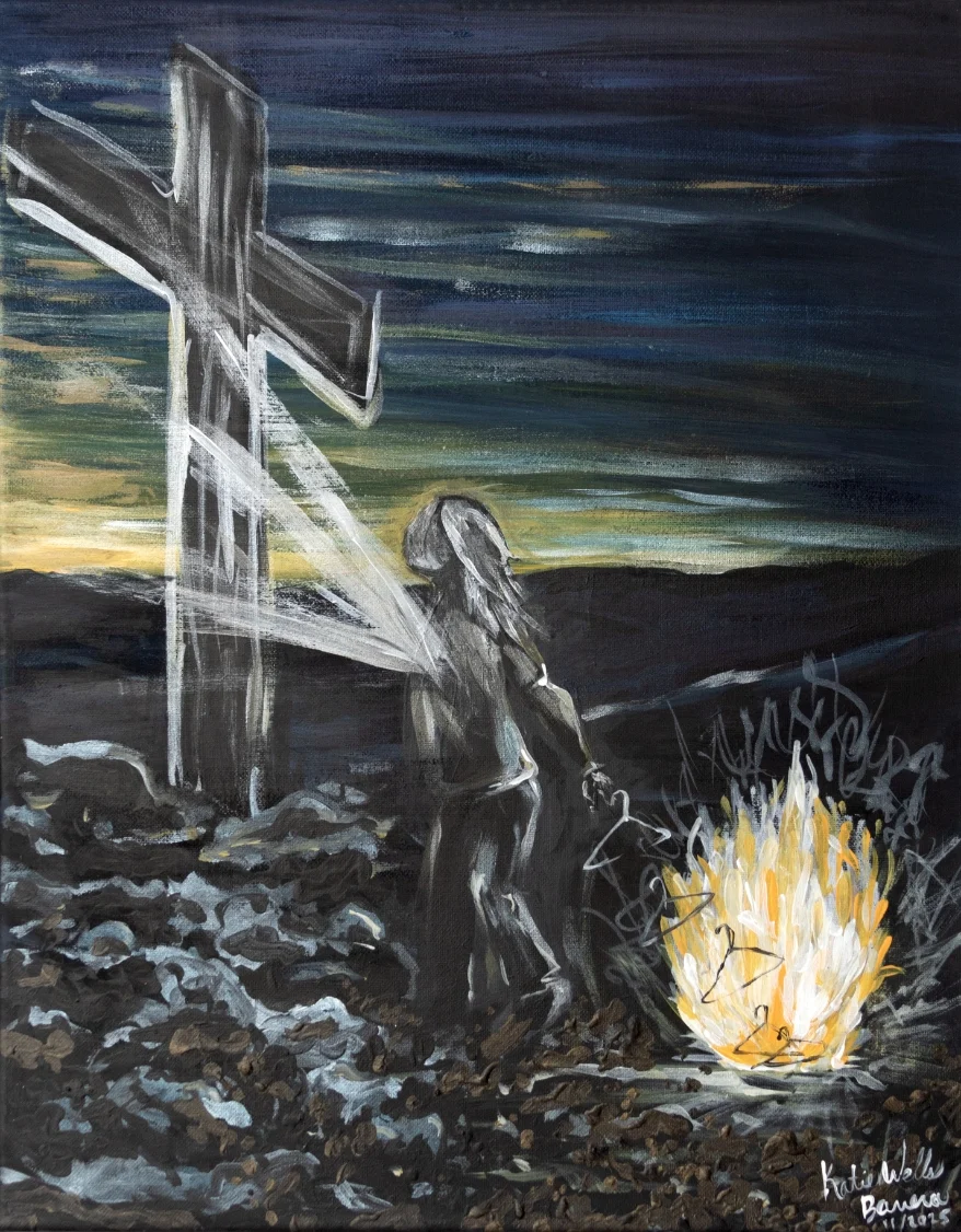 This surrealist acrylic painting is aptly titled “Surrender “. I am the central figure throwing my metal hangers in the fire as I look away and up to the cross. The hangers represent what and WHO I was hanging my hope on. I thought my purpose was serving Jesus and trying to figure out who I was going to marry.